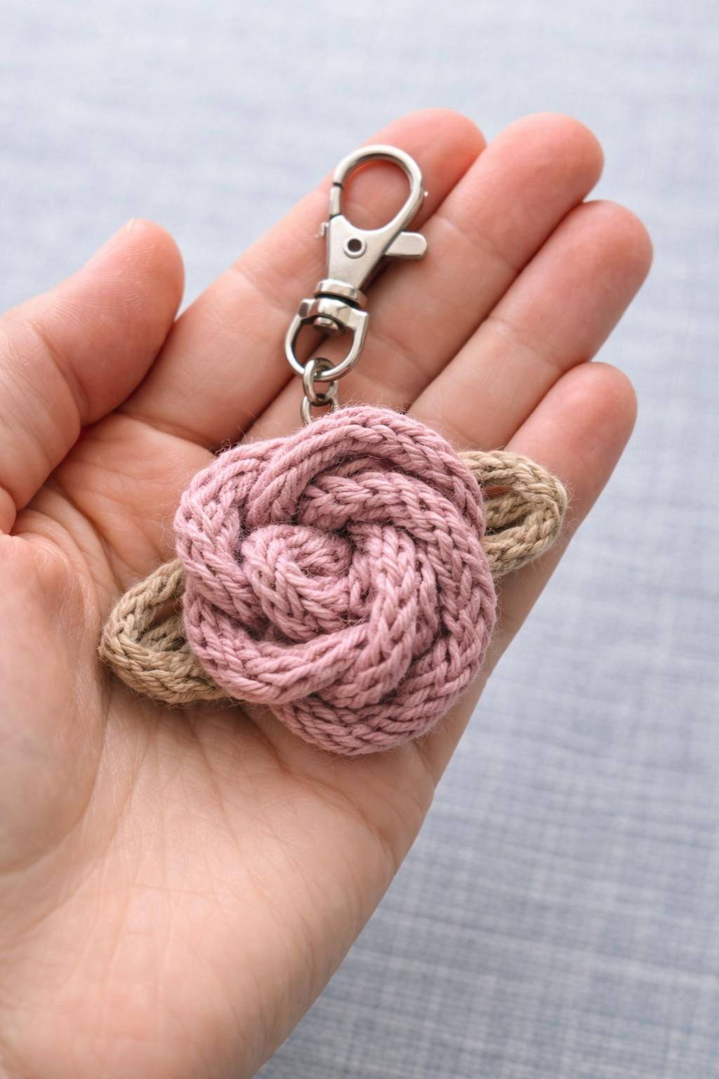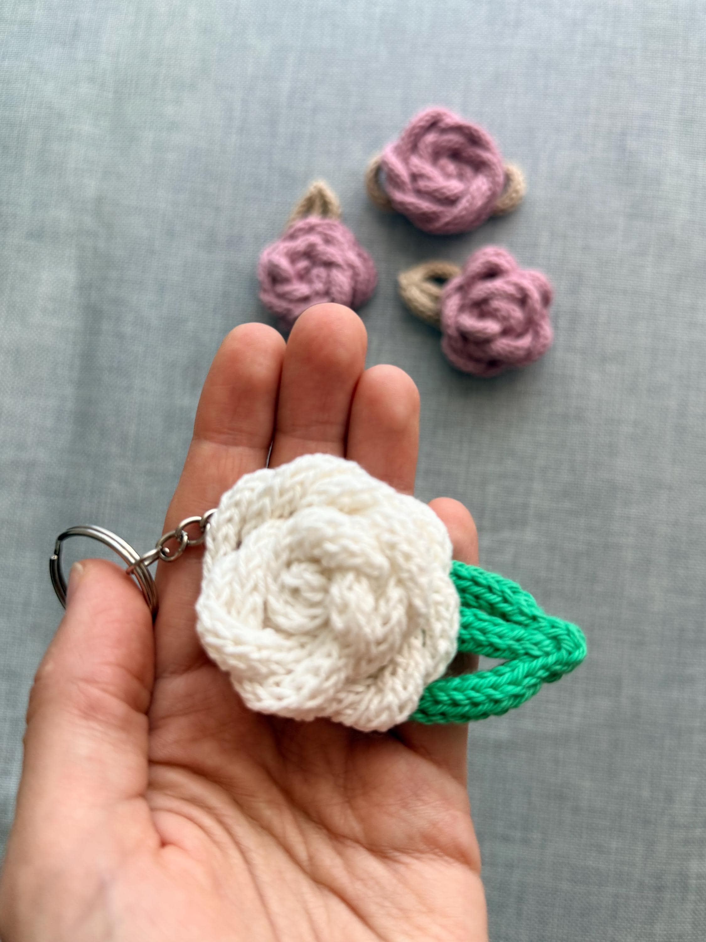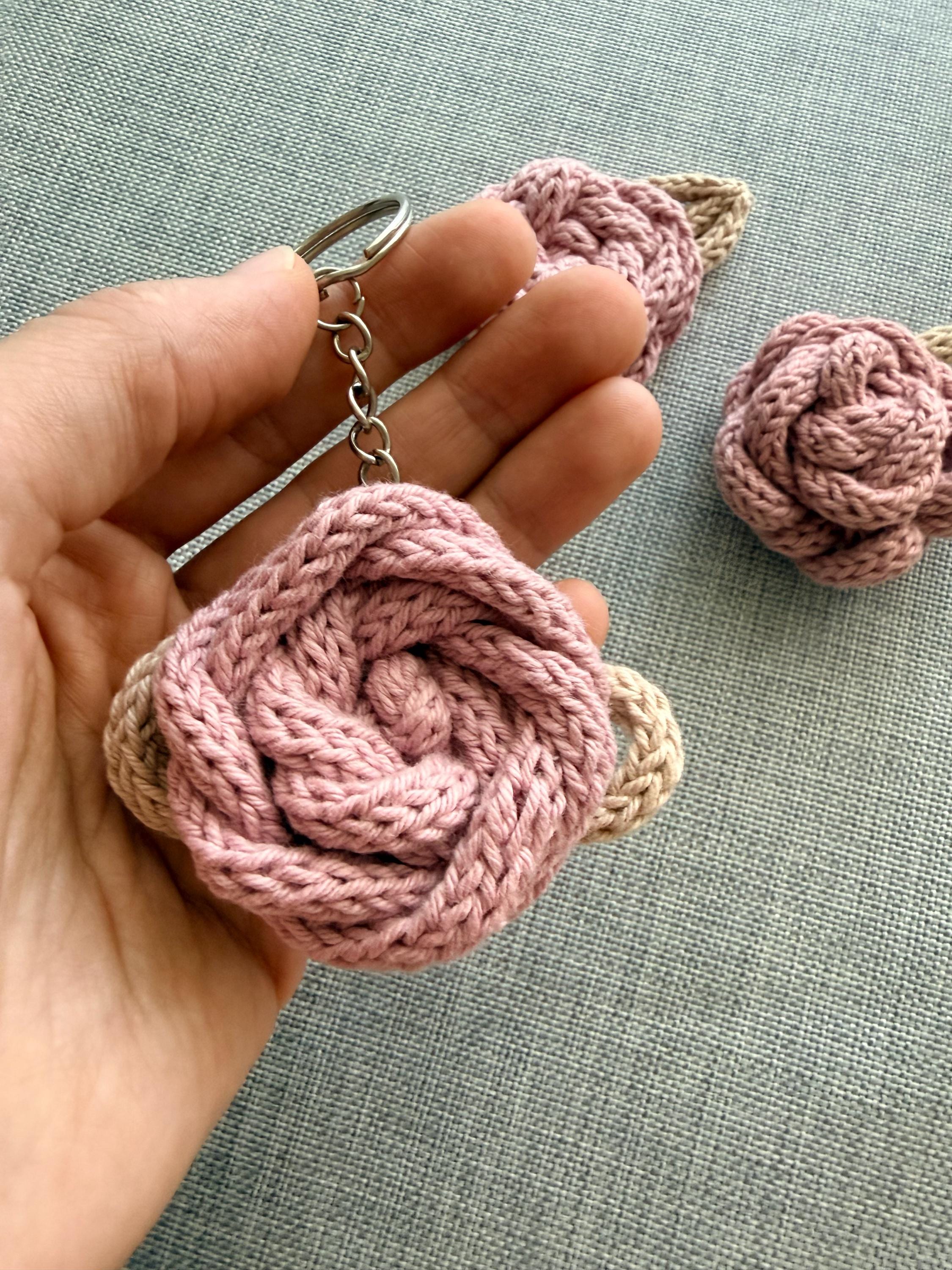Each flower is made using the icord knitting technique, resulting in a lightweight and soft accessory — perfect for keys, backpacks, pouches, or thoughtful gifting.